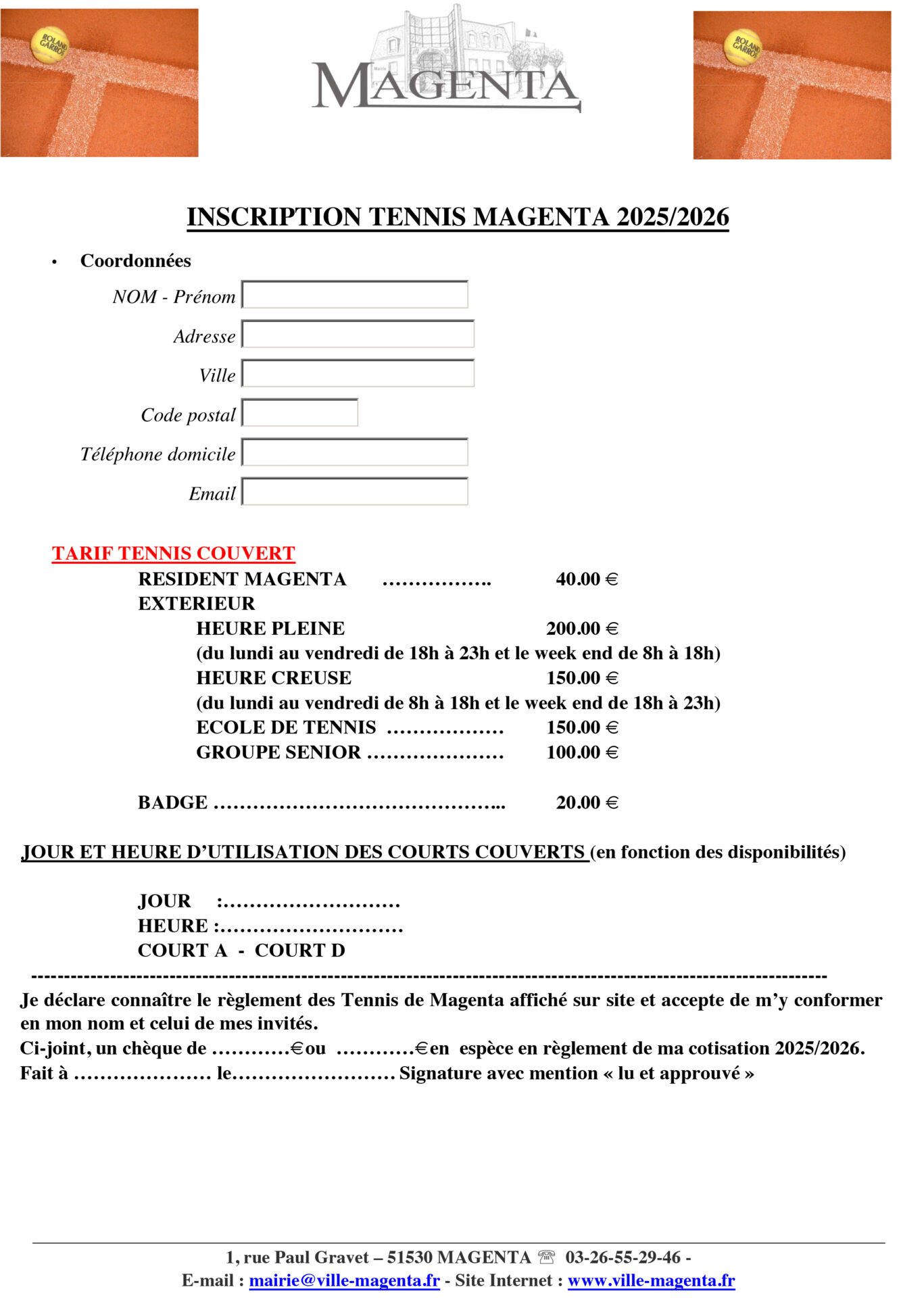 Ces courts sont gérés par la Commune de Magenta et le montant des cotisations fixé par le conseil municipal est valable du 1er septembre au 31 août. Le montant de cette cotisation ne prend pas en compte le badge d’accès qui représente un total de 20 non restitué.